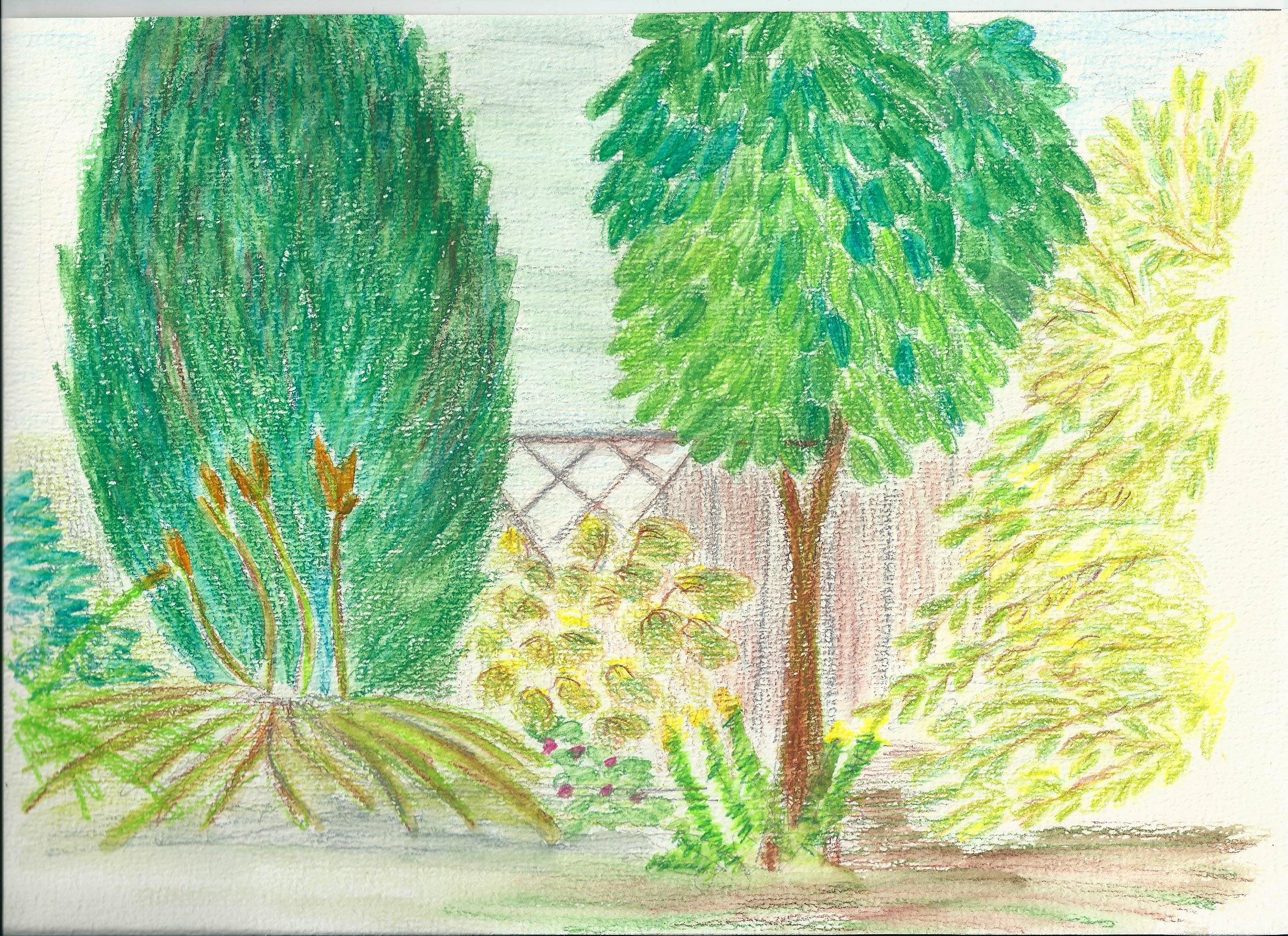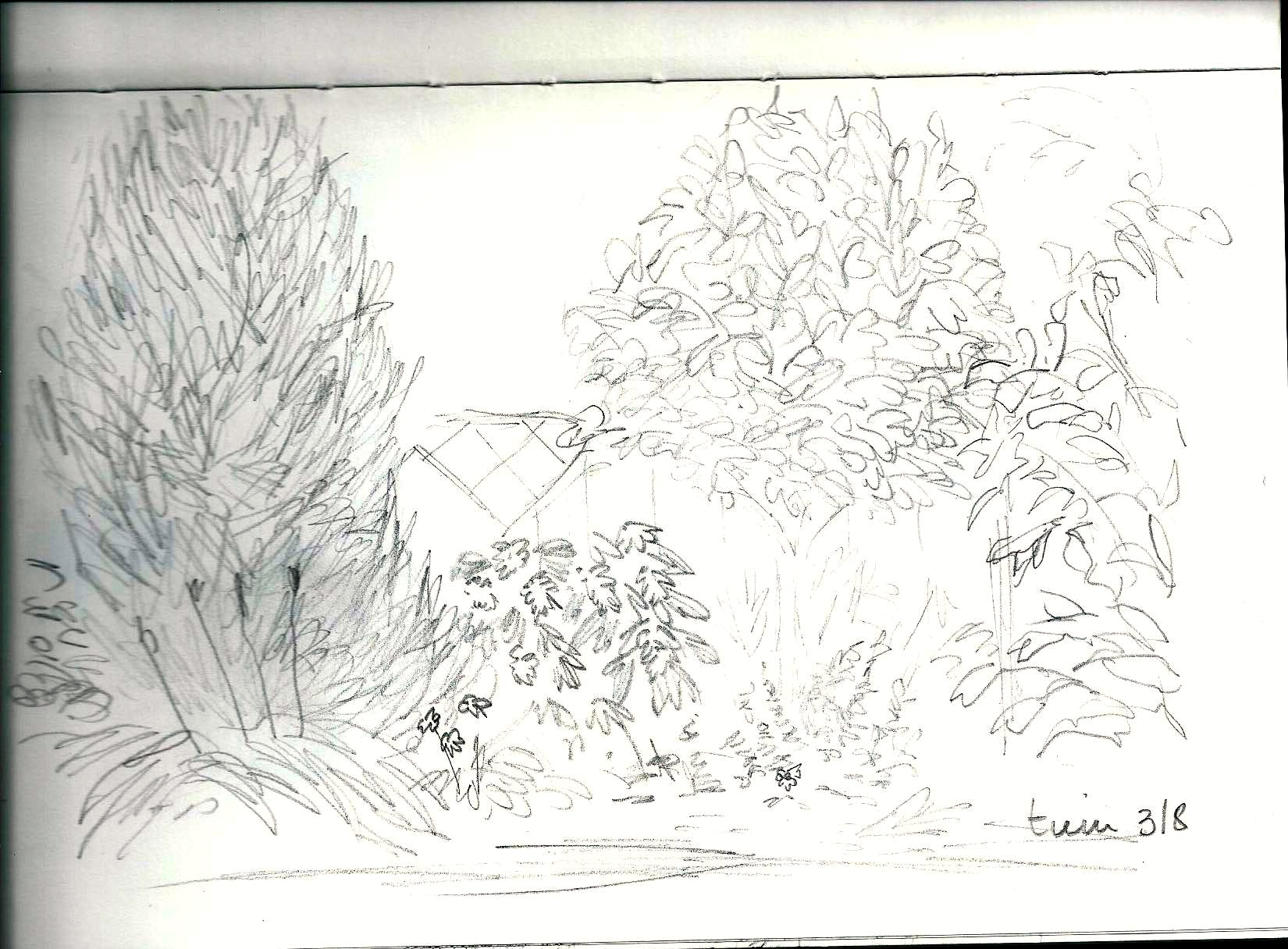 Daarna ben ik aan de slag gegaan op de Ipad. Tot voor kort vond ik dat maar behelpen. Sinds ik heb ontdekt dat je met twee vingers de tekening kunt vergroten en dan veel fijner kunt werken, ben ik helemaal enthousiast over de mogelijkheden. Met de app Sketchbook pro heb ik de twee andere tekeningen gemaakt. De eerste door met voorgeprogrammeerde blaadjes, takjes, en bloemen, die ik op het palet van de app vond, te strooien. De tweede door de penselen en potloden te gebruiken die de app biedt in allerlei soorten en maten. Het ‘echte’ tekenwerk zeg maar. Aan die laatste tekening heb ik de meeste tijd besteed, de andere twee waren allebei binnen een uurtje klaar. Ik vind ze spontaner ogen en daarom beter dan de laatste tekening. Deze is wat vlak geworden en een beetje saai.