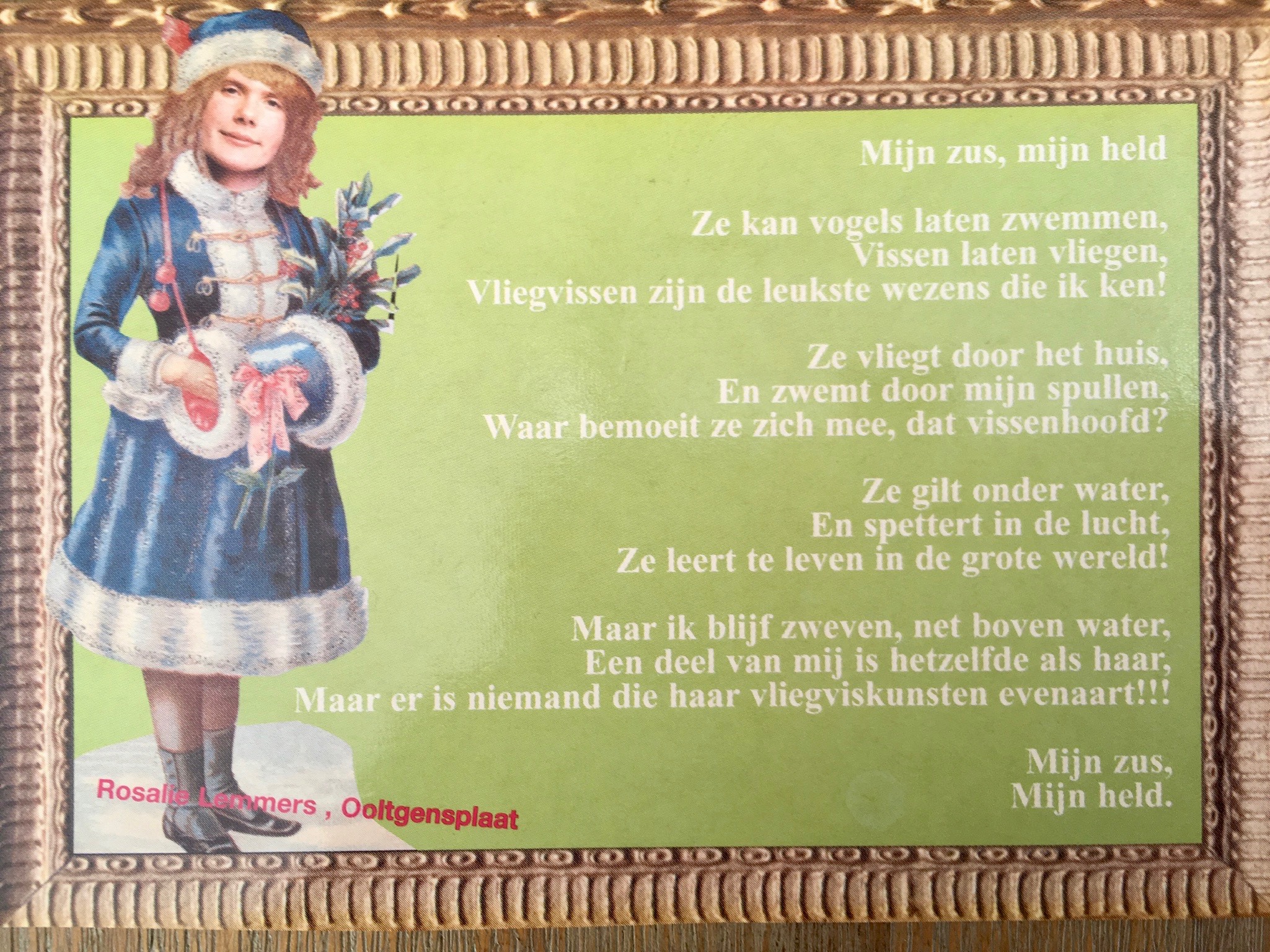 ‘Er is maar een mens op de wereld aan wie ik deze kaart kan sturen,’ schreef mijn zus op de achterkant van een kaart. Op de voorkant stond een gedicht van Rosalie Lemmers.
