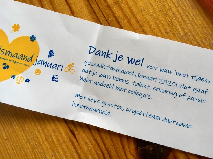 Januari was bij ons op het werk de gezondheidsmaand. Ik geef het direct toe, niet bijster origineel. Met het begin van het nieuwe jaar barst iedereen van de goede voornemens en initiatieven. Maar het werd een verrassend leuke maand op kantoor met allerlei mooie activiteiten en ook nog wat blijvertjes.