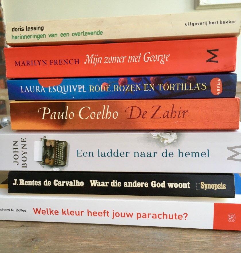 Deze opdracht is zelfs te doen bij een hittegolf. Hij lukt vast ook bij winters weer, als je verlangt naar de zomer. Maar ik stond vandaag in het halfduister voor mijn boekenkast, koos lukraak wat titels uit. Gerangschikt en nog eens gerangschikt, tot ik tevreden was. Wacht nog een boek er boven op, bij wijze van titel. Lees hier hoe de opdracht werkt. Pas op: het is verslavend, geen boekenkast is meer veilig.