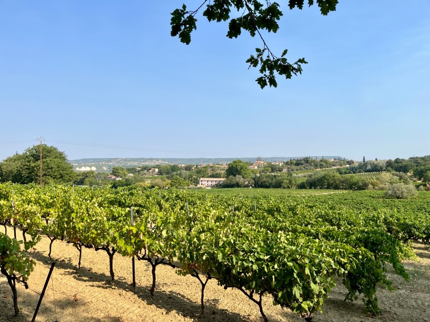 We wandelen dus in de ochtend naar dommelige dorpjes in de buurt. Behalve het paars van de lavendel, is er het frisse groen van de beregende druivenranken, het diepe groen van de cipressen en het rood van een jurk.