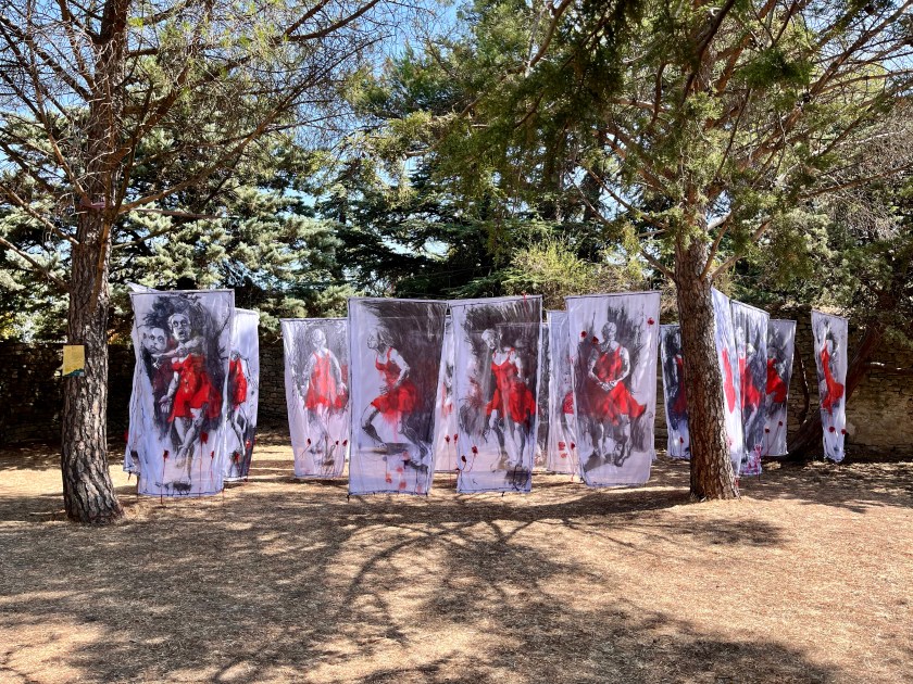 Ik plof neer op een bankje om beter te kunnen kijken. Ik zie een vrouw in een rode jurk die danst. Al haar bewegingen zijn gevangen op witte lakens die als schone was aan een lijn zijn opgehangen. De wind laat de lakens wapperen en de vrouw stampt, draait om haar as, wiegt met haar heupen en houdt haar hoofd fier omhoog. Het is een kunstwerk van Anne Bothuon. Het doet me denken aan de video Why I Never Became a Dancer, Tracey Emin, een Engelse kunstenaar laat al dansend zien dat de pestkoppen uit haar jeugd haar er niet onder hebben gekregen.