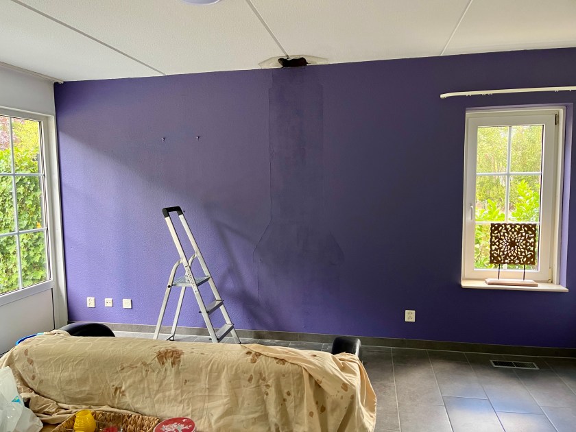 Een regenachtige zondag is het juiste moment om iets van onze zomervakantie vast te leggen. Een hele wand krijgt de kleur van een veld bloeiende lavendel. De zon gaat er gelijk van schijnen.