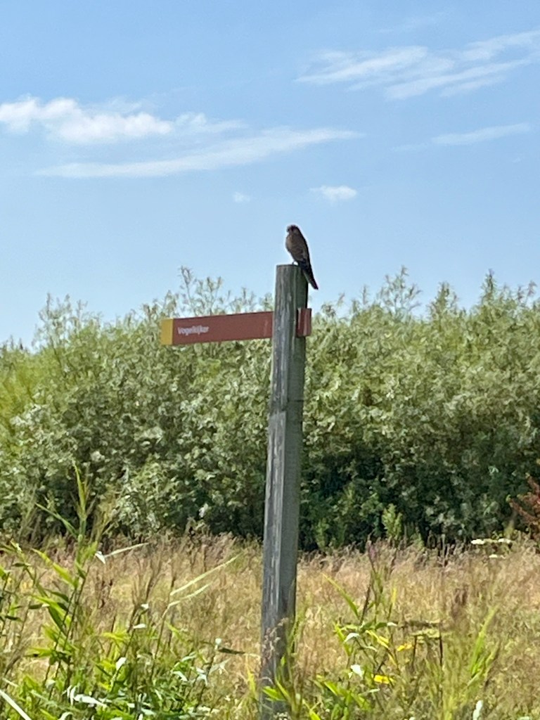 Veel vogels hebben het Bentwoud al ontdekt. Deze roofvogel heeft een toepasselijke uitkijk gevonden op deze richtingaanwijzer. Verderop zag ik nog een blauwe reiger op een brug zitten en hoorde ik een tjiftjaf.