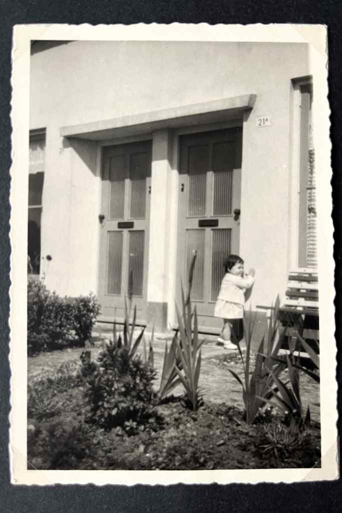 Mijn ouders kochten in 1958 het huis op huisnummer 21, tegenwoordig nummer 61, van de aannemer Sooi van Gils. Het was een twee-onder-een-kapwoning. Samen met huisnummer 21a, is het gebouwd op de fundering van een boerderijtje. Hier zie je mij op weg naar buurvrouw Nelly. En dat was niet een route van voordeur naar voordeur maar de veel langere route van achterdeur naar achterdeur. Voor iemand die net kon lopen een hele prestatie. Maar dat had ik graag over een koekje of snoepje. Bij mijn weten is onze voordeur nooit gebruikt, iedereen kwam in die tijd achterom. Iemand die aanbelde, maakte je achterdochtig, die wilde je vast iets verkopen wat je niet nodig had.