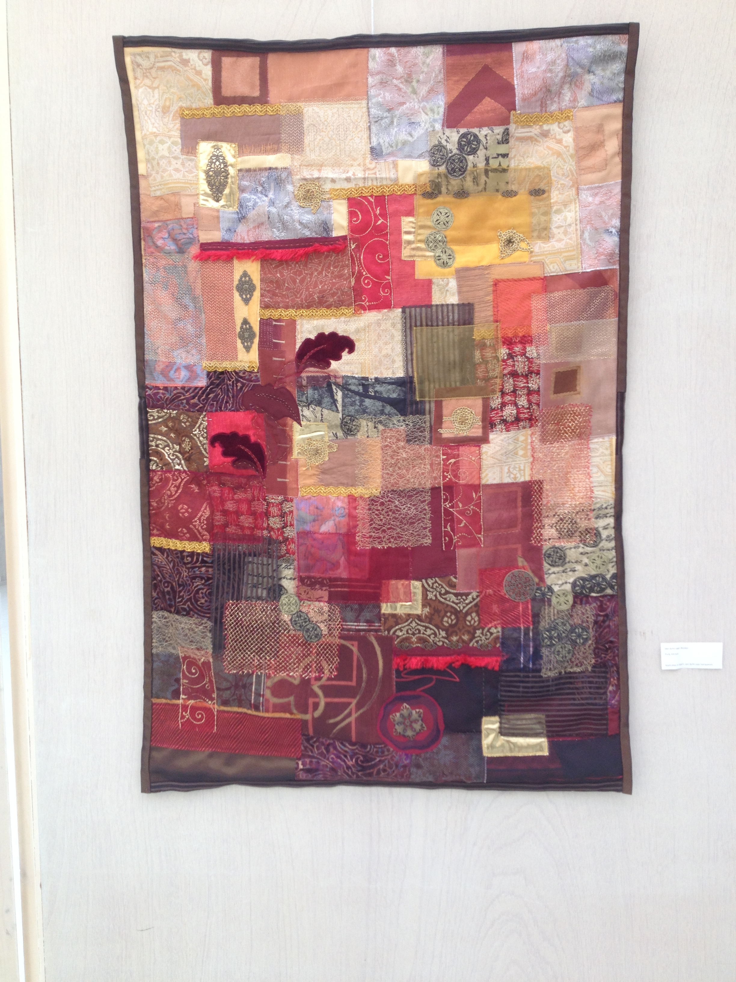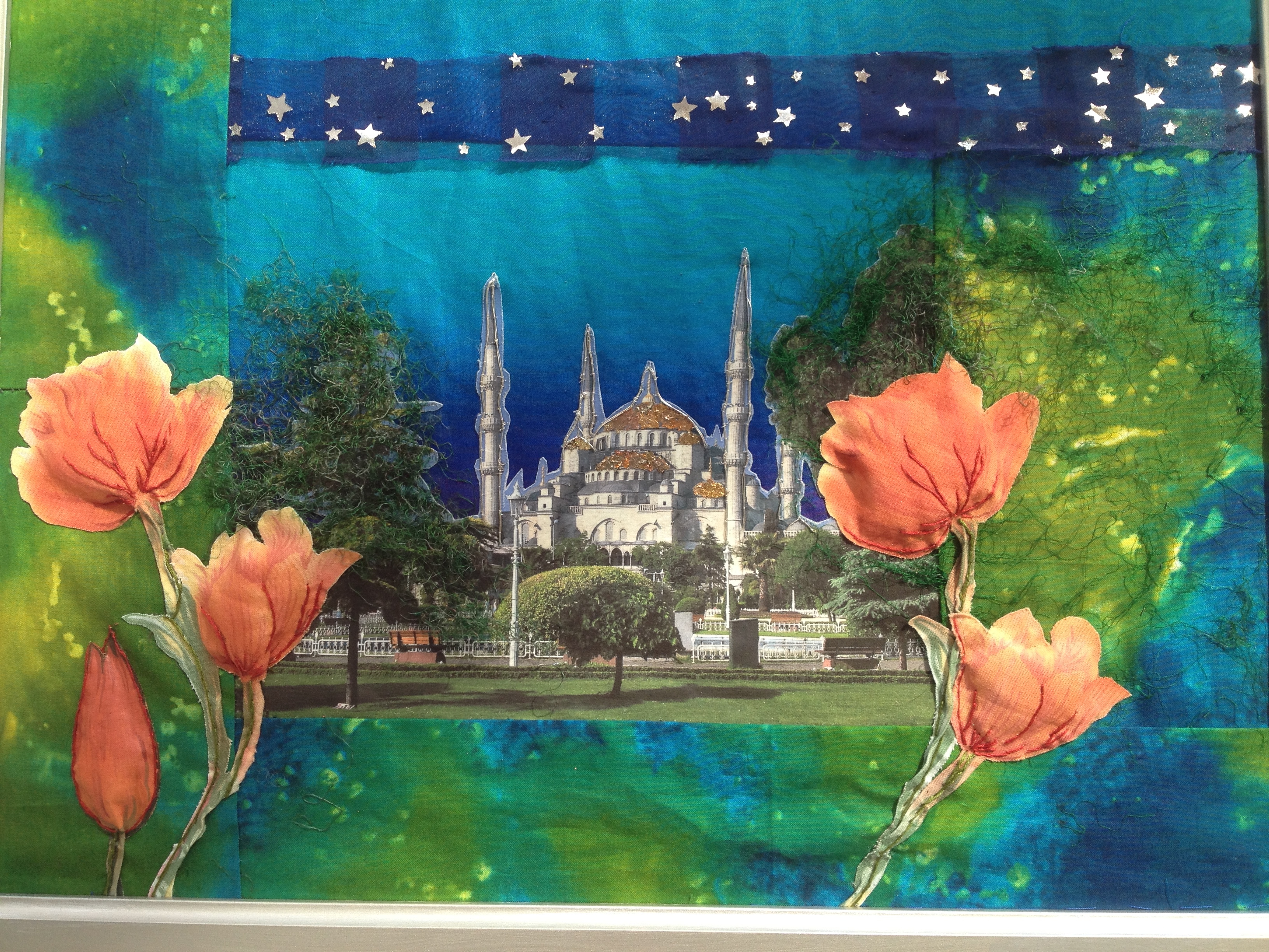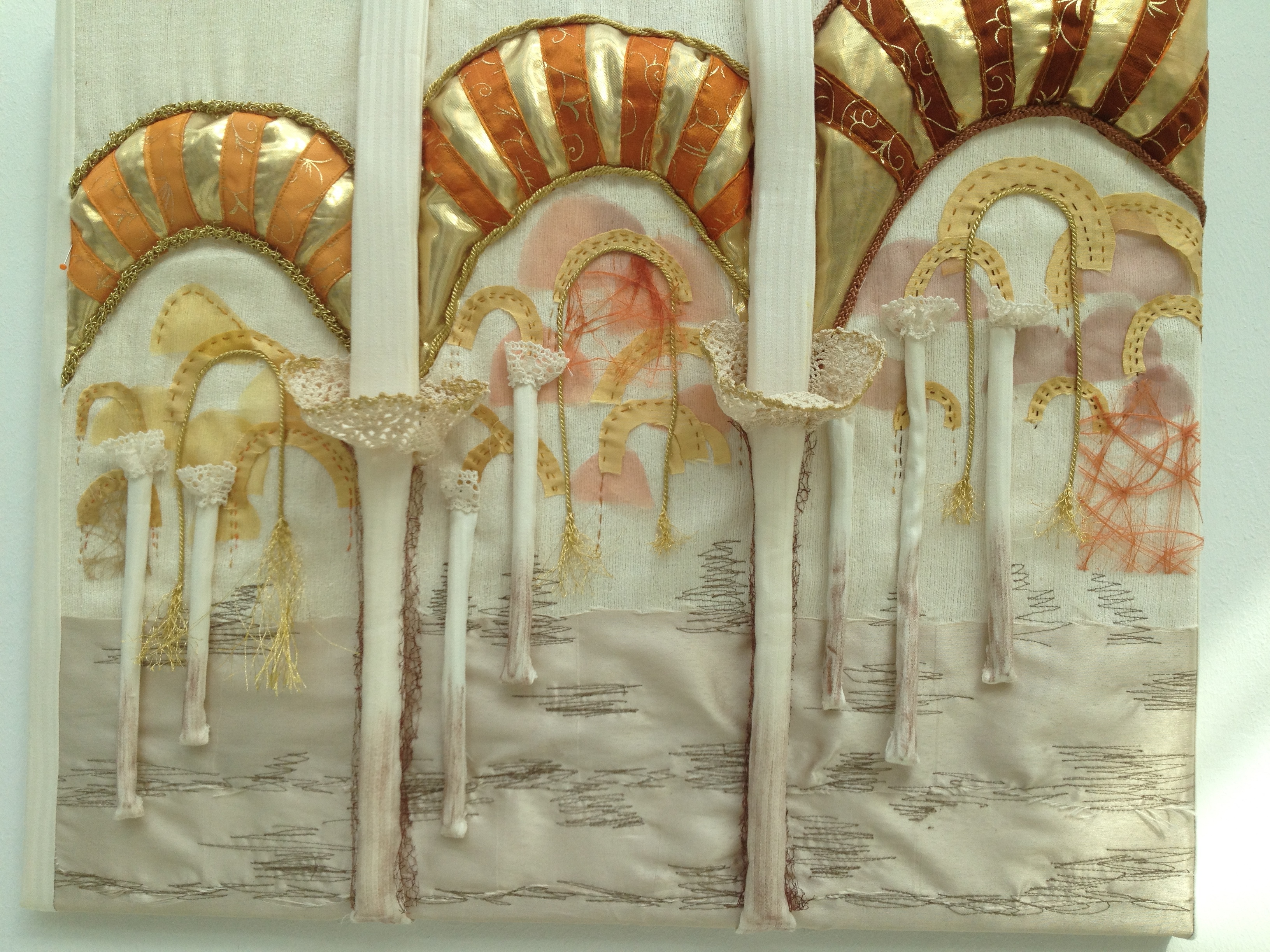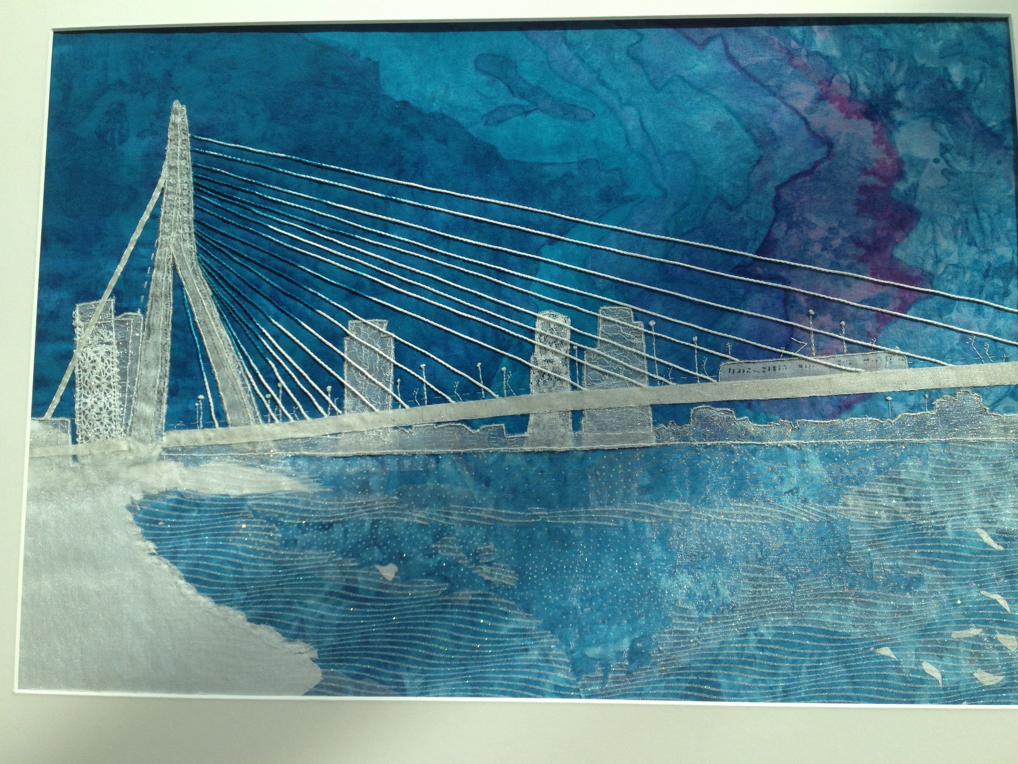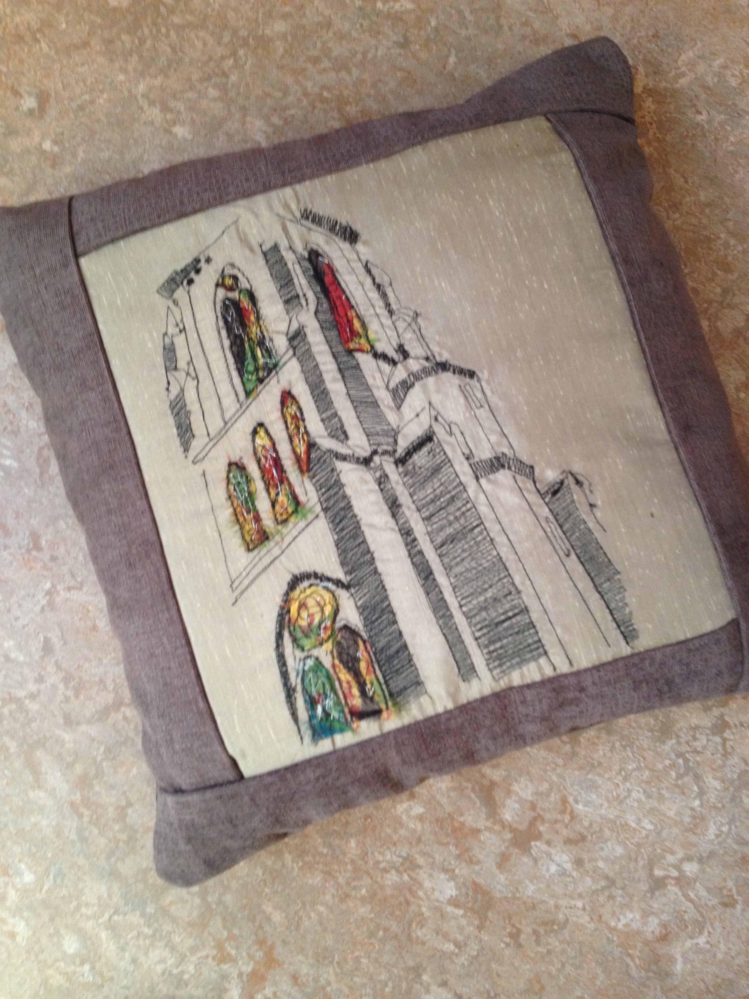 Tussen mijn foto’s vond ik er een van een kerk van Cuypers, de heilige Antonius van Padua, vlak bij Vorden. Tegenwoordig is hierin het heiligenbeeldenmuseum gevestigd, over macht en pracht gesproken. Direct wist ik, dit moet een pentekening worden. Op glanzende stof heb ik dat op de naaimachine geprobeerd dat na te bootsen. De gebrandschilderde ramen zijn snippers van een oud sjaaltje. Het eindresultaat is een kussen.