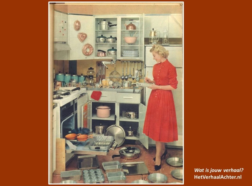 Carla kijkt Anton licht verwijtend aan. Ze staat temidden van een uitstalling van al het kookgerei waarmee in de loop der jaren hun kasten zijn gevuld.