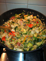 Salades zijn favoriet. Vooral met couscous of bulgur zijn ze zo klaar. Zoete rode aardappel is ook erg lekker. Met verse groenten en kruiden kun je eindeloos variëren. Hieronder mijn eigen versie van een salade uit de Allerhande van een jaar of twee geleden.